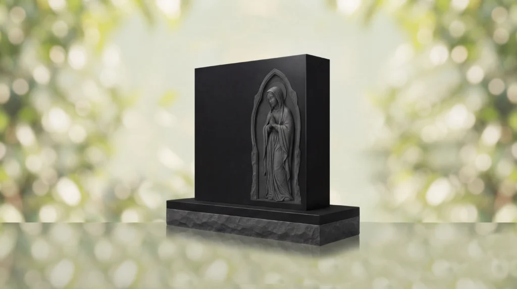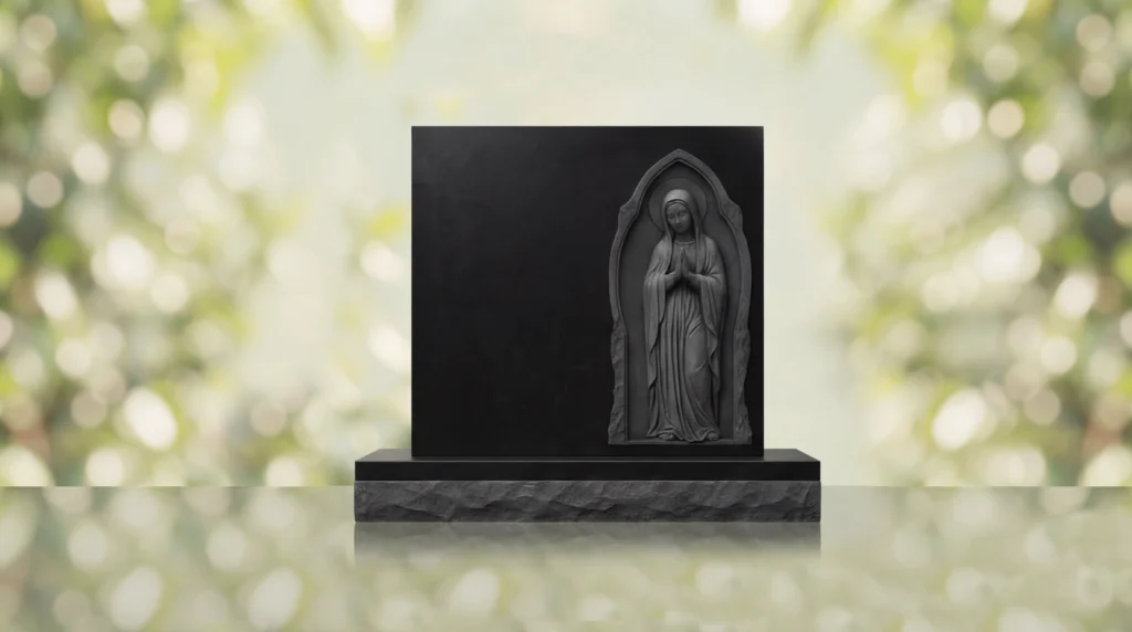 Crafted from durable quality granite memorial stone, this granite memorial is built to endure for generations in cemetery settings. The smooth face provides space for sandblasted engraving of names, dates, and personal inscriptions, and the engraving remains clear and does not fade over time. With detailed hand craftsmanship in the sculpted religious figure and dependable materials throughout, this affordable headstone is a quality granite memorial made for enduring tribute.