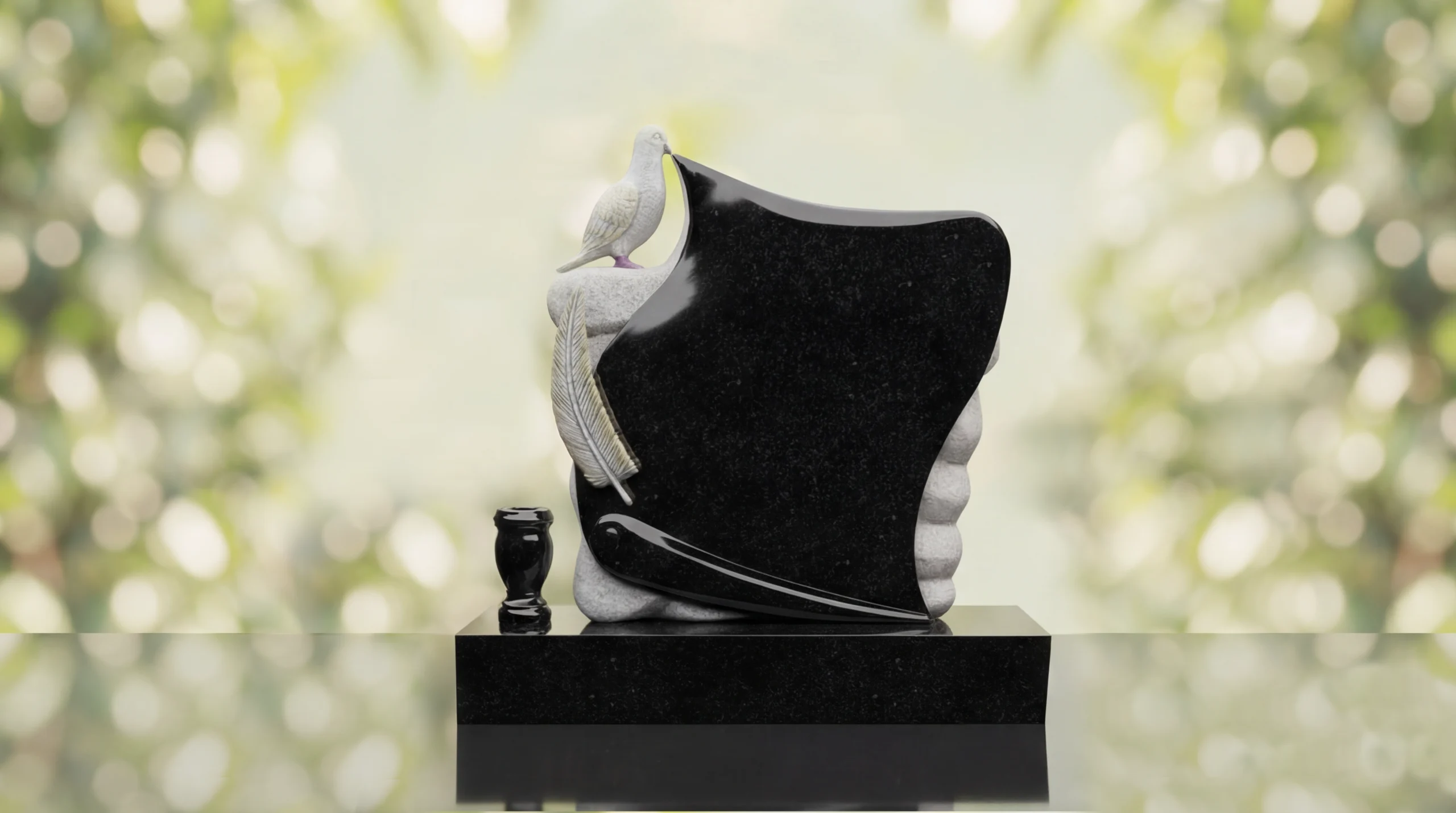 Crafted from durable quality granite memorial stone, this granite memorial is built to endure in cemetery settings for generations. The polished face can be personalized with sandblasted engraving for names, dates, and inscriptions, and the engraving remains clear and does not fade over time. With detailed hand craftsmanship in the dove and feather sculpture and dependable materials throughout, this affordable headstone is a quality granite memorial made for enduring beauty and strength.