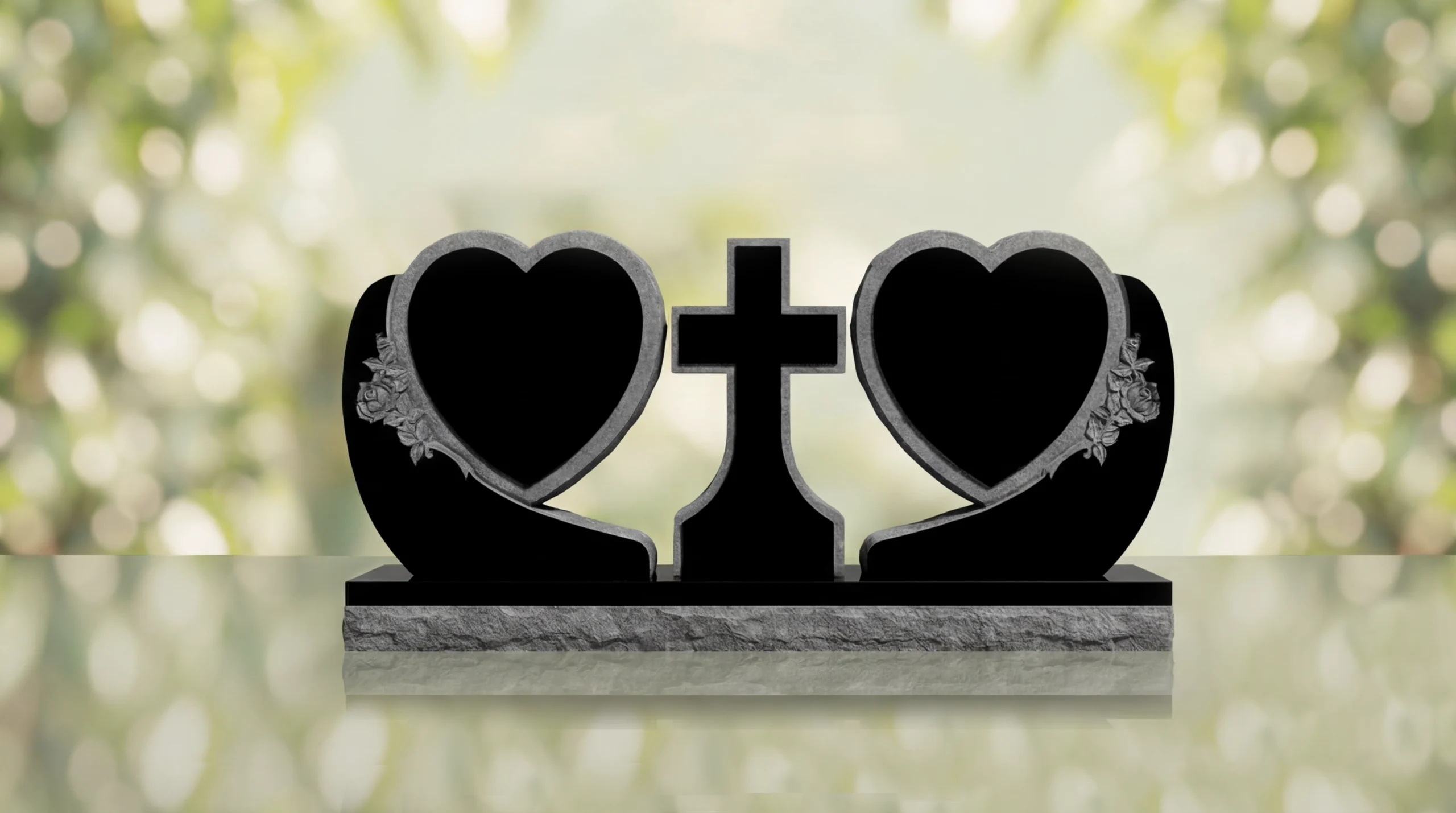 Crafted from durable quality granite memorial stone, this granite memorial is made to endure for generations in cemetery settings. The polished faces provide space for sandblasted engraving of names, dates, and personal inscriptions, and the engraving remains clear and does not fade over time. With careful hand craftsmanship in the shaped hearts and carved floral accents, this affordable headstone is a quality granite memorial created for lasting beauty and strength.
