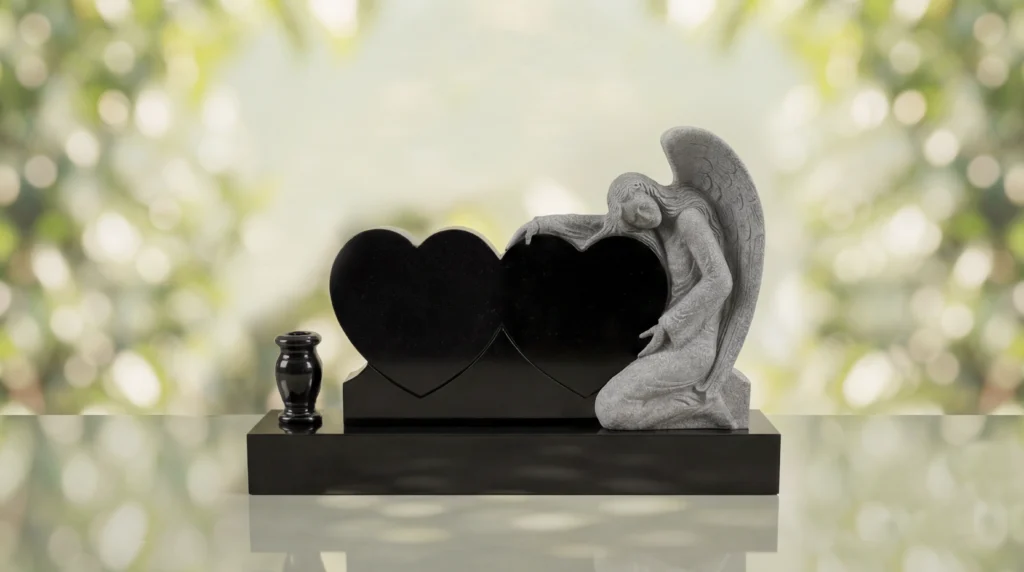 The Angel Companion Heart Headstone is a companion memorial style designed to honor two loved ones with twin heart-shaped tablets and a graceful angel figure. Created as a comfort memorial, this monument serves as a meaningful headstone and grave marker that reflects love, remembrance, and a lasting spiritual connection.