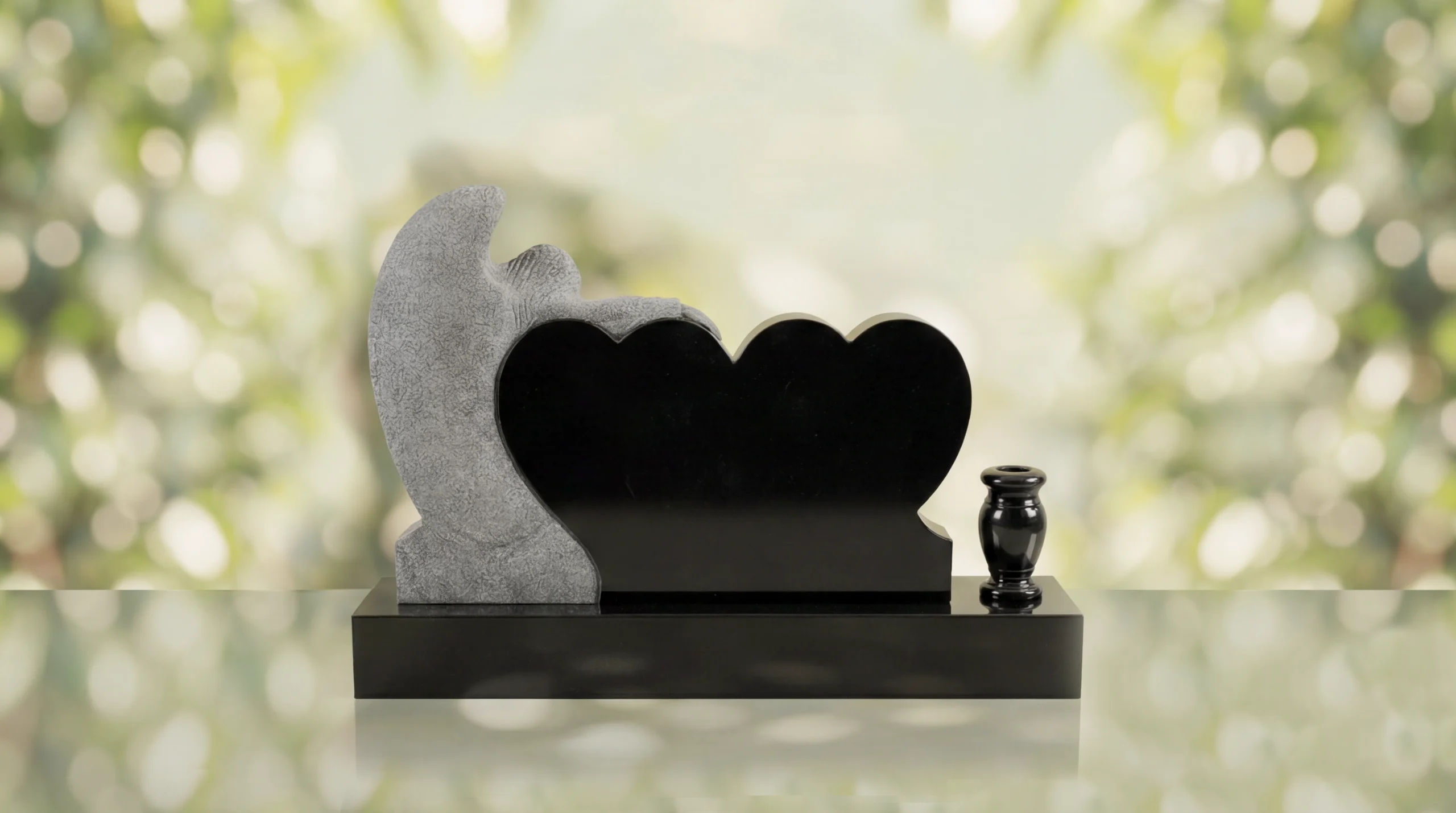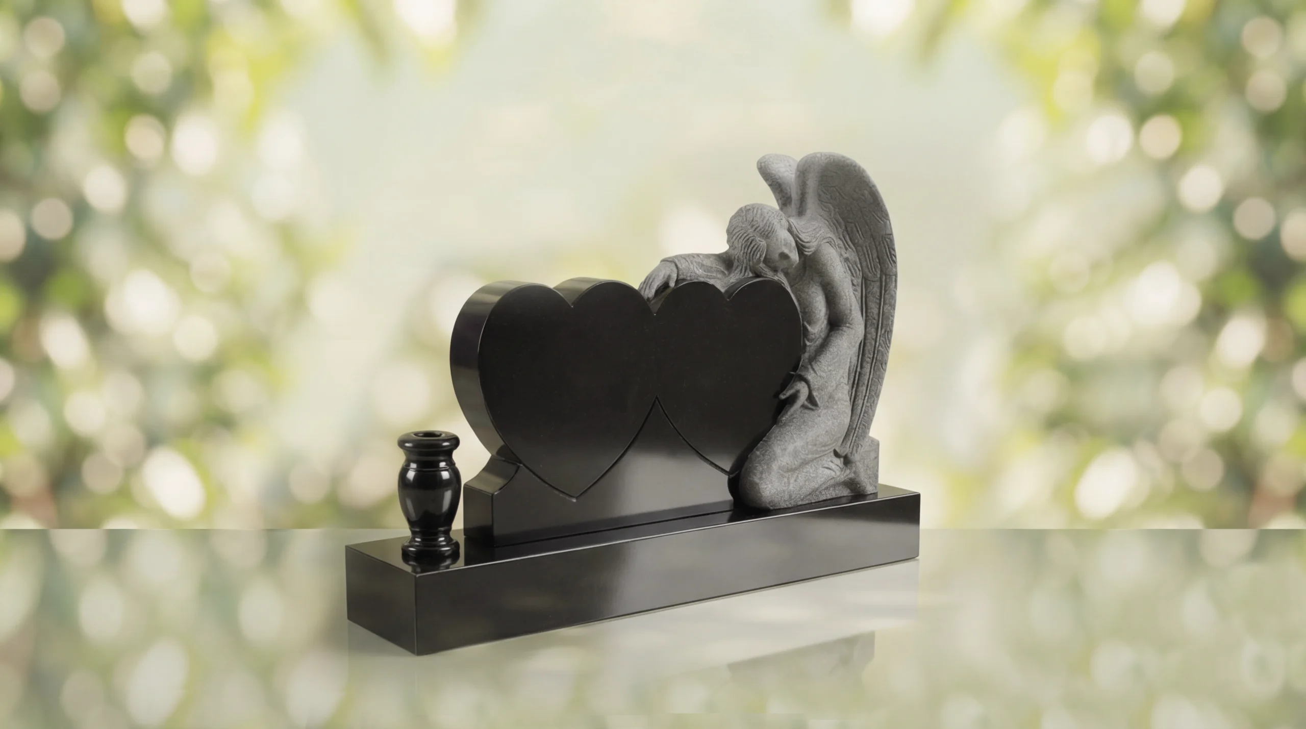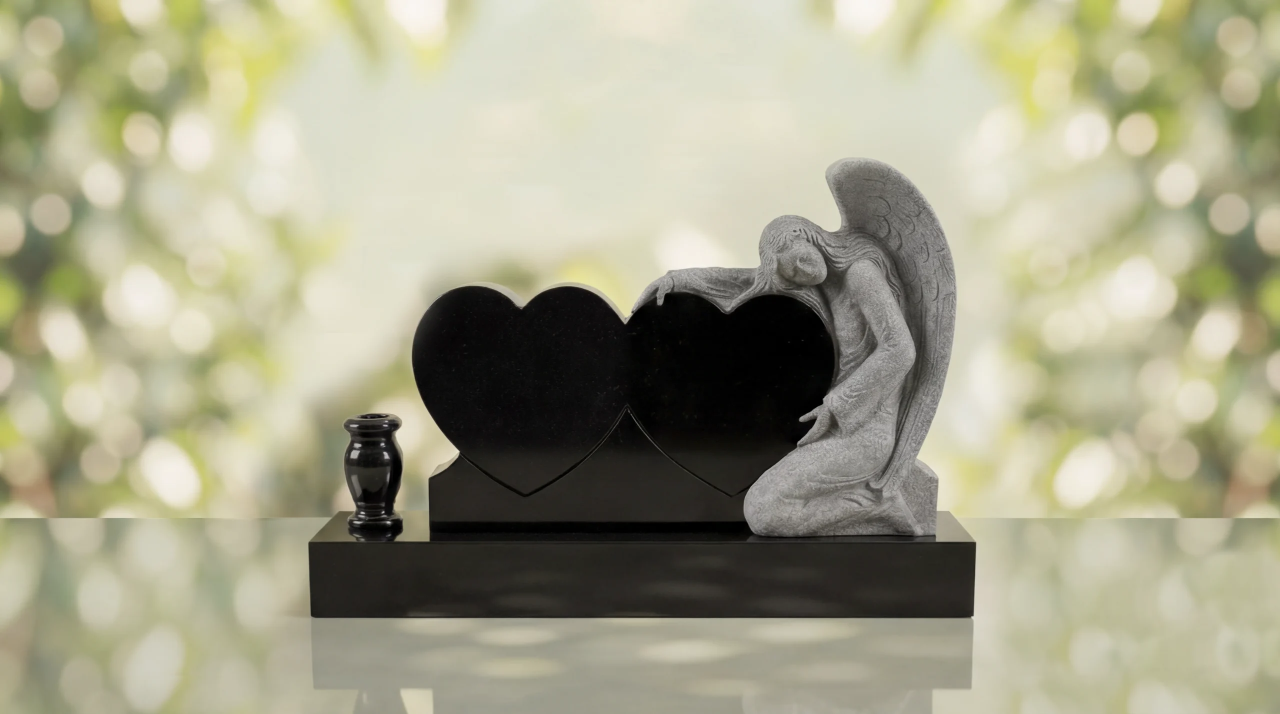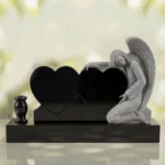 Crafted from durable quality granite memorial stone, this granite memorial is built to endure in cemetery settings for generations. The polished heart faces provide space for sandblasted engraving of names, dates, and personal inscriptions, and the engraving remains clear and does not fade over time. With detailed hand craftsmanship in the sculpted angel and dependable materials throughout, this affordable headstone is a quality granite memorial made for enduring beauty and strength.